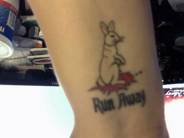 tattoo #2, for christmas my ex jake told me he'd pay for me to get this tattoo i wanted done on my foot. i had said before i wanted a pair of boots tattooed on my foot so i'd always be ready to "stompy dance" since i had noticed it sucks to try to do so without oddly large footwear. he drove me to a tattoo parlor to hear me say ya that really does not sound like a good idea... so a couple days earlier i had revisited some JTHM comics and commented that filler bunny would make a really cute tattoo. i remembered this, did some googling, and now have a 1.5" high filler bunny on my left thigh