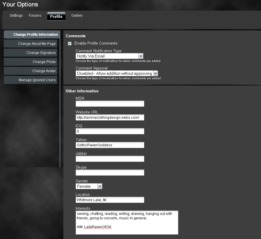 GothicRavenGoddess (3) Posted July 20, 2009 Posted July 20, 2009 Oh, I just realized: There's no option to put in your AIM screen name, as a contact... I take a screen shot of it for you, so you can see what I'm talking about: (I cut some of the other stuff out of the page so that you could see the top of the page and the section I was talking about, without the page being so long lol... that's under the "Personal Setting" option)