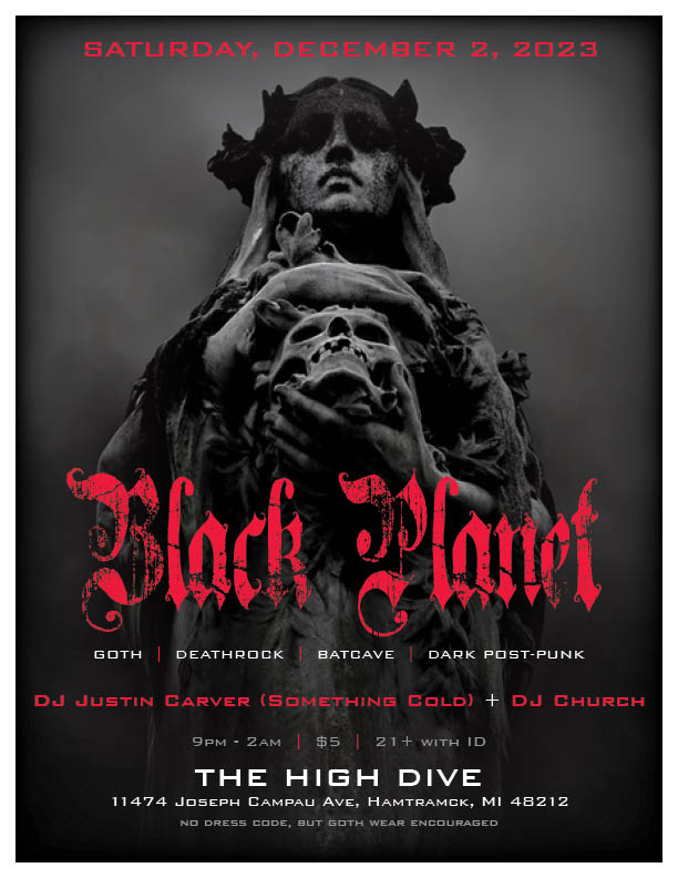 DJ Saint Posted November 27, 2023 Posted November 27, 2023 Saturday, December 2 A special evening at Hamtramck’s High Dive: B L A C K P L A N E T Goth | Deathrock | Batcave | Dark Post-Punk No industrial. No EBM. No techno. Just the haunting moody vibes of acts like Sisters of Mercy, Bauhaus, Corpus Delicti, UK Decay, The Damned, Cinema Strange, Killing Joke, Christian Death, Siouxsie and The Banshees, Birthday Party, The Cure, Joy Division and PLENTY PLENTY more. A TRUE GOTH NIGHT! DJ Justin Carver & DJ Church provide the tunes from extensive goth vinyl collections! For those who haven’t been to the High Dive - it’s the perfect atmosphere for Black Planet with its salvaged architectural arches transformed into stunning art pieces. No dress code, but goth attire is always encouraged! 9pm - 2am | 21+ | $5 The High Dive 11474 Joseph Campau Ave, Hamtramck, MI 48212 Come lurk in the shadows! gwen 1